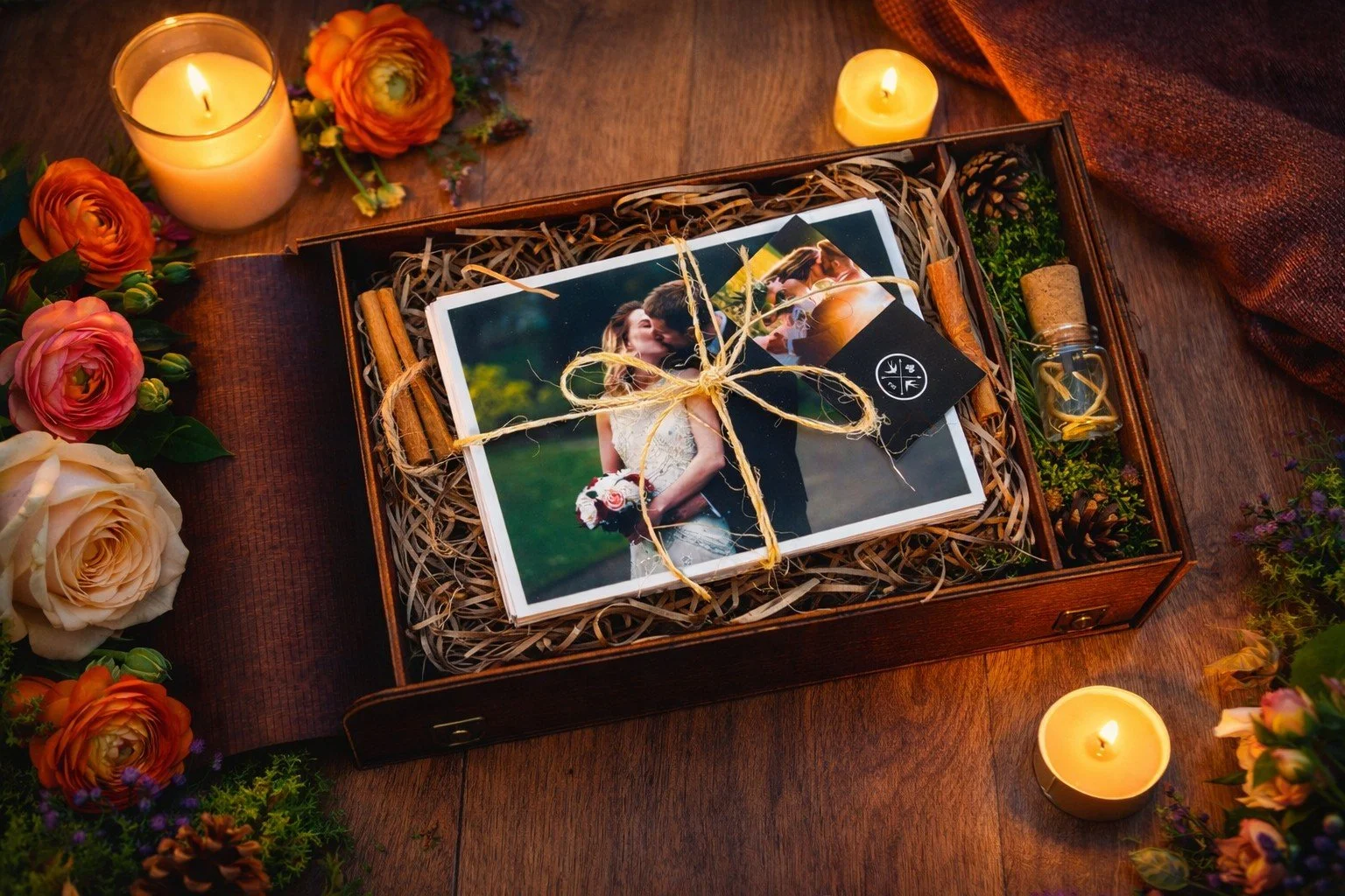 Ręcznie robione pudełko – w środku ponad 110 wyjątkowych odbitek w formacie 13x18 cm oraz elegancki pendrive, na którym zachowane są wszystkie wspomnienia